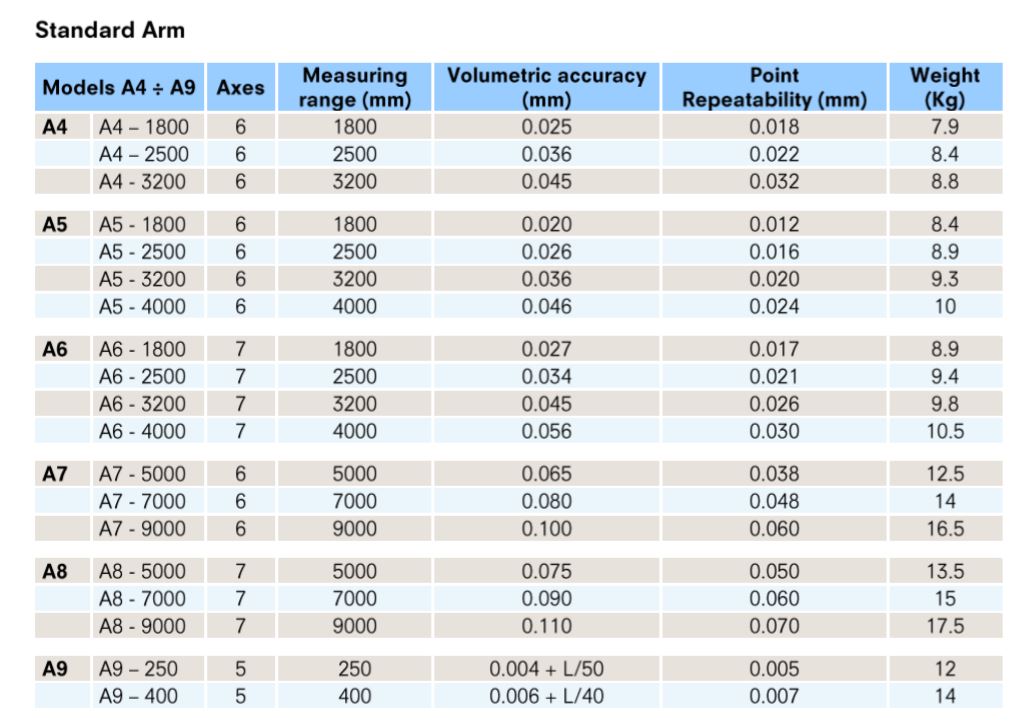 系列關節臂依據ISO10360-2標準,可以對大、小尺寸部件進行品質控制、檢查和驗證。由於擁有非常堅固的碳纖維結構,所有的機型都很輕便且易於操作.可以根據需求選擇A4,A5,A6,A7,A8或者A9機型。